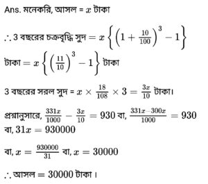 - যদি বার্ষিক 10% হারে কিছু টাকার 3 বছরের চক্রবৃদ্ধি সুদ ও সরল সুদের অন্তর 30 টাকা হয়, তবে ঐ টাকার পরিমাণ কত হিসাব করে লিখি ।